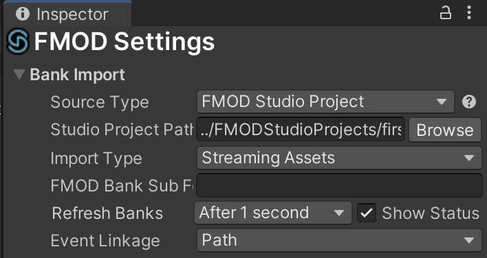 Assets/Plugins/Resources/FMODStudioSettings중 Studio Project Path에 FMOD Studio에서 생성 한 프로젝트 연결.fspro의 경로를 지정하여야 함- 예시
